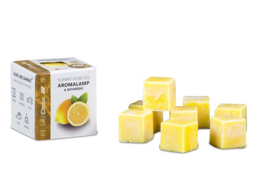 Vonný vosk Svieži citrón je vyrobený z kvalitného palmového vosku a vonných esencií, ktoré zaisťujú sviežu, citrusovú a dlhotrvajúcu vôňu citróna. Vosk je rozdelený do 8 kociek, ktoré je možné použiť v elektrických aj klasických aromalampách na čajovú sviečku. Je vhodný na osvieženie interiérov a je možné ho používať priamo v priestore bez nutnosti aromalampy. Rozmery: dĺžka 1,6 cm, šírka 1,6 cm, výška 1,6 cm. Hmotnosť: 30 g. Farba: svetlo žltá.