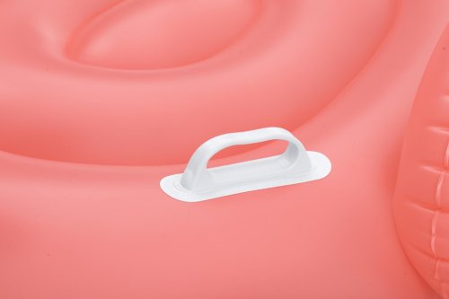 Plameniak je vybavený dvoma vzduchovými komorami, čo zvyšuje jeho bezpečnosť a stabilitu na vode. Na bokoch sú umiestnené praktické biele úchyty, ktoré pomáhajú deťom udržiavať rovnováhu a uľahčujú manipuláciu s hračkou. Tieto úchyty sú ergonomicky tvarované a pevne pripevnené k nafukovacej konštrukcii, takže ponúkajú spoľahlivú oporu počas používania. Nafukovací ventil je modrý a ľahko prístupný, čo uľahčuje rýchle nafúknutie a vyfúknutie plameniaka.