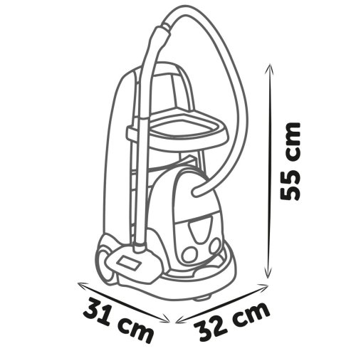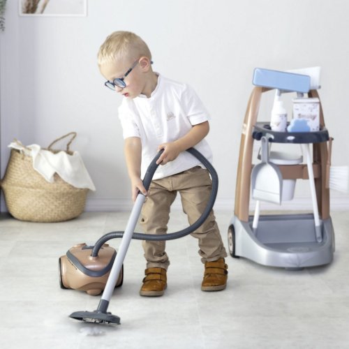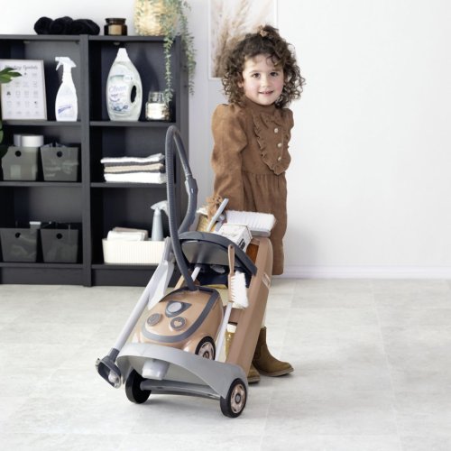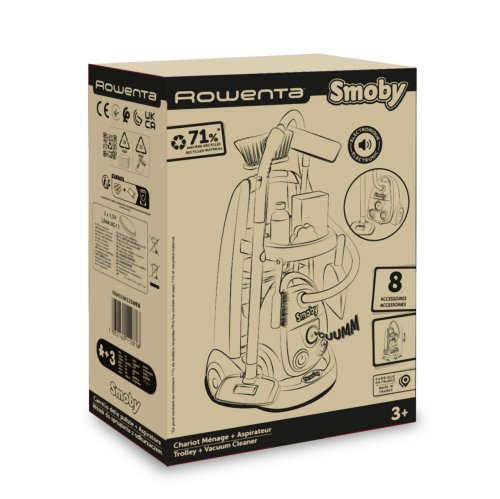 Upratovací vozík s vysávačom Rowenta s príslušenstvom. Detský vysávač vydáva skutočný zvuk vysávača. Vďaka kompaktnej veľkosti a nízkej hmotnosti je ľahko ovládateľný aj pre menšie deti od 3 rokov. Ďalšie príslušenstvo k upratovaciemu vozíku: lopatka a metlička, mop a makety obalov od čistiacich prostriedkov atď. Tento výrobok obsahuje minimálne 71 % recyklovaného materiálu. Rozmery produktu (DxŠxV): 31 x 32 x 55 cm.