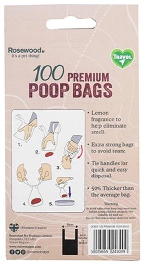 Vrecká sú nepostrádateľným pomocníkom pri upratovaní psích exkrementov. Rosewood Premium Poop Bags sú navyše väčšie a mimoriadne pevné (až o 50% hrubšie) ako bežné vrecká na psie výkaly. Vrecko je možné po použití zaviazať a má citrónovú arómu. Zloženie: recyklovaný plast Rozmery (cca): šírka 26 cm, výška (s uchami) 34 cm Farba: čierna