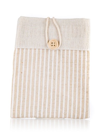 Prírodné dekoratívne vrecúško z bavlny svetlo hnedé s dekorom pruhmi a zapínaním na gombík, rozmer: 10,5 x 14 cm. Vhodný iba na dekoráciu.