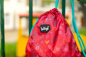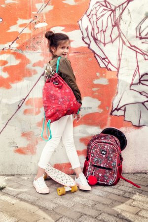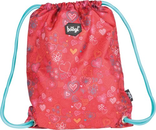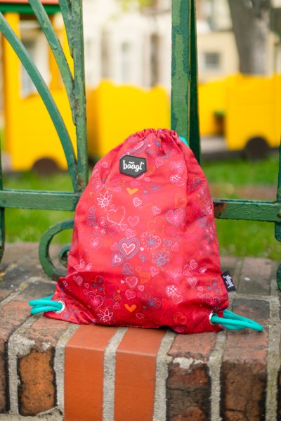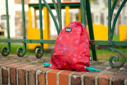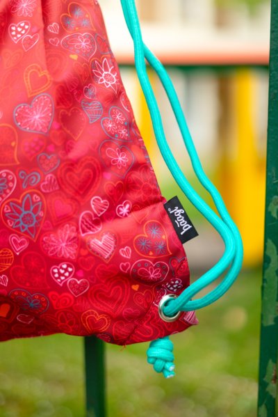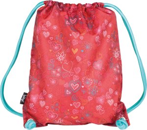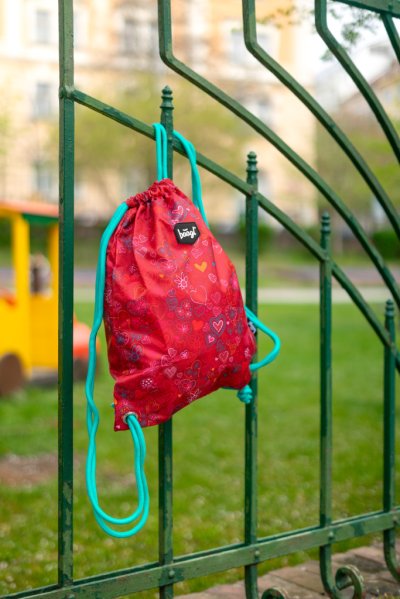 • Vrecko na cvičky alebo prezuvky s motívom sŕdc z pevného umývateľného materiálu • Zdrhovanie pomocou pevných šnúrok, ktoré zároveň umožňujú nosenie na chrbte