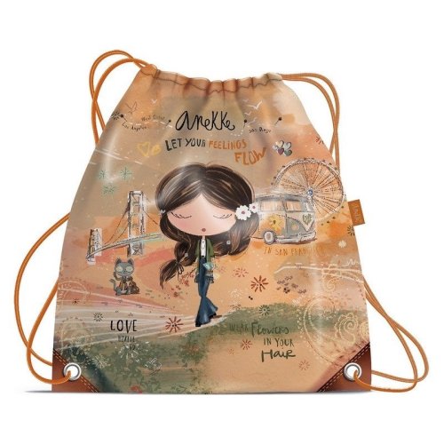 Školské vrecko na prezuvky a športové potreby s vnútorným vreckom na zips <br> • potlačené motívom známeho dievčatka Anekke z dielne španielskej dizajnérky <br> • vrecko, alebo vrecko je skvelé na školský úbor, výtvarnú výchovu, ale aj ako menšia taštička