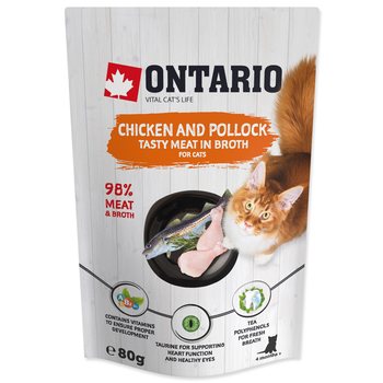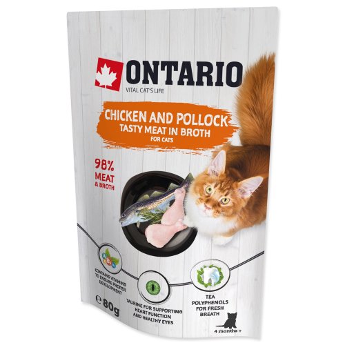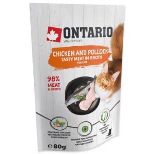 Doplnkové krmivo pre mačky s kuracím mäsom a treskou polak vo vývare .
