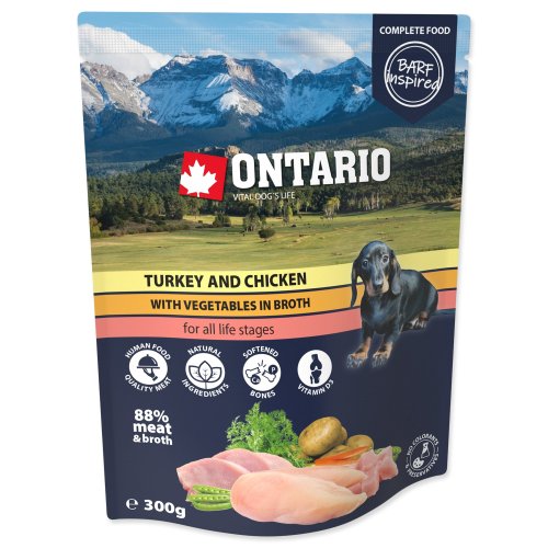 Morčacie a kuracie mäso so zeleninou vo vývare. Kompletné krmivo pre psy všetkých vekových skupín (od 2. mesiaca veku) inšpirované Barfom.