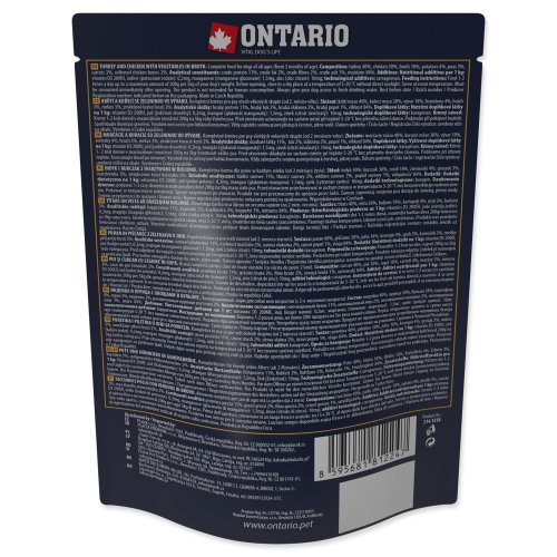Morčacie mäso 40%, kuracie mäso 30%, vývar 18%, zemiaky 4%, hrach 3%, mrkva 3%, zmäkčené kuracie kosti 2%.