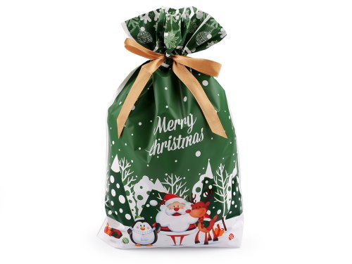 Veľké sťahovacie vrecká s vianočnými motívmi sa skvele hodia [na darčekové balenie rôznych balených pochutín, ale tiež napríklad kozmetiky, sviečok a iných maličkostí]. Sťahujú sa pomocou saténovej stuhy. Vrecká sú matné, zdobené potlačou z oboch strán. Majú rozšírené dno. Výška vrecka po stuhu je 24 cm. Rozmery variantov sa môžu ľahko líšiť.