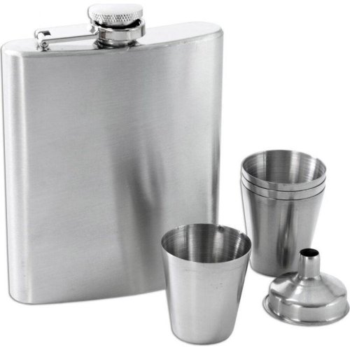 Fľaša vrecková, 4 poháriky a lievik v darčekovej krabičke.