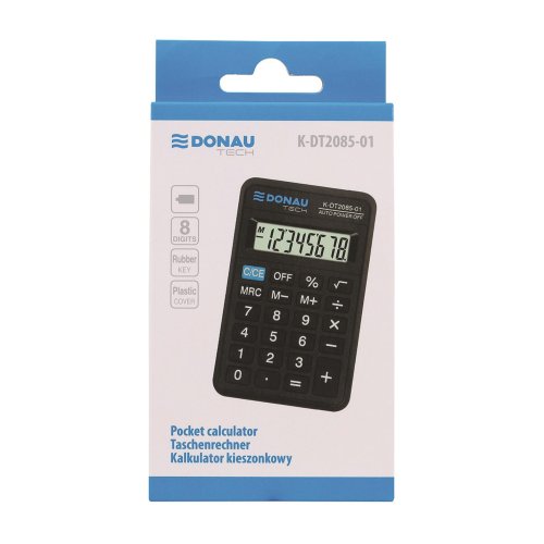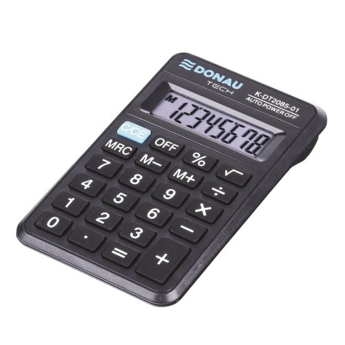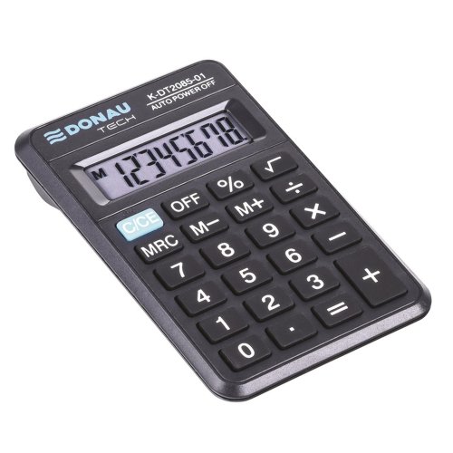 Vrecková kalkulačka 8-miestny displej Funkcia: percentá, odmocnina Funkcia automatického vypnutia Farba: čierna Materiál: plast Rozmery: 114 x 69 x 18 mm Batériové napájanie Batéria: typ AA 1,5 V