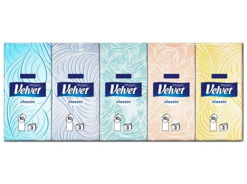 Jemné hygienické vreckovky Velvet classic sa skladajú z troch vrstiev mäkkého papiera. Kombinácia piatich optimistických vzorov s dizajnom prinášajúcim pozitívne emócie as klipom, ktorý sa pohodlne otvára, získa uznanie aj u tých najnáročnejších zákazníkov, ktorí si, okrem praktických vlastností, cenia aj elegantný vzhľad. Nové vreckovky Velvet classic majú výnimočný, jemný vzor na okraji vreckovky s motívom kvetín, vďaka čomu je vreckovka ešte mäkšia. Výrobok má atest PZH.