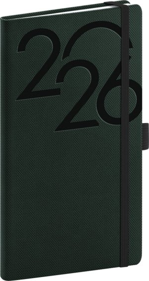 Vreckový diár Ajax 2026 v zelenej farbe. Jemne štruktúrovaný povrch s atypickým reliéfom je vhodný pre všetky typy razieb. Diár má zaguľatené rohy, pútko na ceruzku a elastickú gumičku. Týždenný rozvrh s česko-slovenským kalendáriom a doplnkovou angličtinou, nemčinou, maďarčinou a ruštinou.