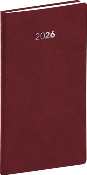 Plánovací vreckový diár Balakon 2026 v prevedení bordó, doplnený o strieborný letopočet. Povrch diára si získal obľubu vďaka kvalitnému vrchnému materiálu, ktorý je extrémne odolný voči vonkajšiemu poškodeniu. Týždenný rozvrh s česko-slovenským kalendáriom a doplnkovou angličtinou, nemčinou, maďarčinou a ruštinou.