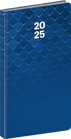 Vreckový diár Cambio 2025 v modrej farbe. Týždenný rozvrh s česko-slovenským kalendáriom a doplnkovou angličtinou, nemčinou, maďarčinou a ruštinou.