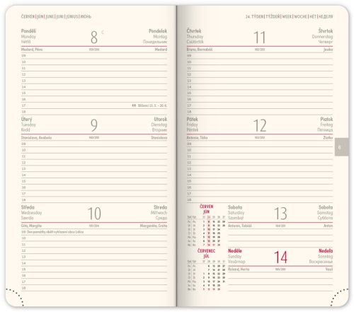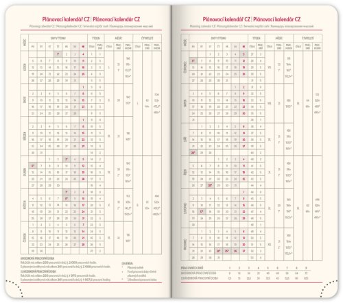 Nový rad diárov s výrazným letopočtom. Povrch má jemnú štruktúru a je vhodný pre všetky typy razieb. Týždenné rozloženie s česko-slovenským kalendáriom a doplnkovou angličtinou, nemčinou, maďarčinou a ruštinou.