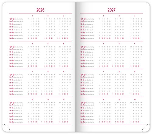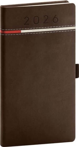 Vreckový diár Tomy 2026 v hnedo-červenej farbe. Klasický povrch imitujúci kožu, ktorý dopĺňa jemné prešitie. Na materiál je možné tlačiť a je vhodný pre všetky typy razieb. Týždenný rozvrh s česko-slovenským kalendáriom a doplnkovou angličtinou, nemčinou, maďarčinou a ruštinou.