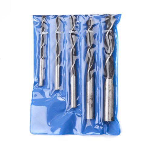 Súprava 5 vrtákov do dreva s hrotom. Skrutkový tvar zabraňuje zaseknutiu a zaisťuje rýchly úber triesky.