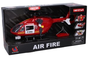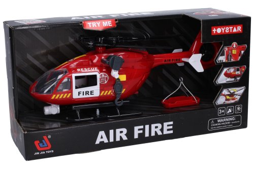 Vrtuľník hasičský s efektmi. Rozmery 38x12x16 cm. Svetelné a zvukové efekty tlačidlom na bočnej strane vrtuľníka. 2xAAA batérie zo spodnej strany vrtuľníka súčasťou. Otváracia predná a zadná (nakladacia plocha) dvere. Vysúvacie lano s hákom pomocou otočnej páčky. Súčasťou lehátko na hák. Funkcia na obrázkoch na obale.
