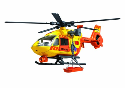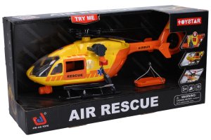 Vrtuľník záchranársky s efektmi. Rozmery 38x12x16 cm. Svetelné a zvukové efekty tlačidlom na bočnej strane vrtuľníka. 2xAAA batérie zo spodnej strany vrtuľníka súčasťou. Otváracia predná a zadná (nakladacia plocha) dvere. Vysúvacie lano s hákom pomocou otočnej páčky. Súčasťou lehátko na hák. Funkcia na obrázkoch na obale.