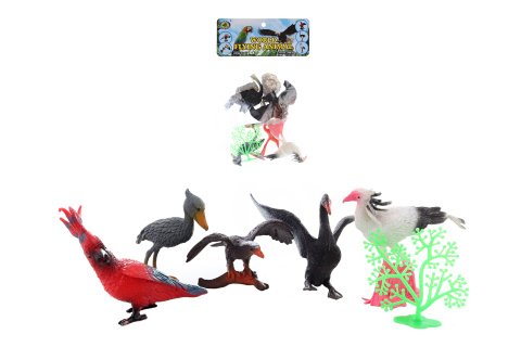 Plastový vtáky v sáčku. Balenie obsahuje 5 vtákov - veľkosť vtáka cca 9 cm, plastový strom a 2x plastový kameň. Rozmer balenia cca 27 x 17,5 cm. Vek 3+