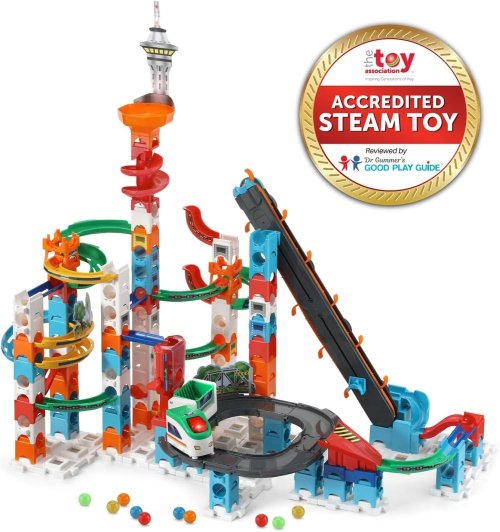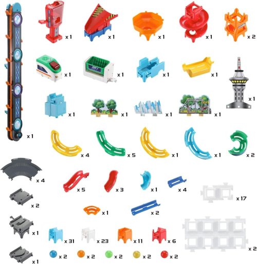 To musíte zažiť! Guličky, ktoré sa závratnou rýchlosťou rútia dolu zákrutami, špirálami, cez mosty, aby ich nakoniec naložil vlak a výťahom poslal späť na vrchol! Skvelá hudba a bláznivé zvuky doplnia túto super akčnú zábavu! Spoznajte nával vzrušenia pri odpaľovaní guličiek. Sledujte dráhu a súťažte s rodinou a priateľmi. Kreatívna a zábavná guličková dráha ponúka neobmedzené možnosti zostavy a hry. Je možné spájať s ostatnými dráhami. Pokiaľ radi staviate, zostavujete a máte kreatívne myslenie, potom je to hra presne pre vás. Fantázii a vlastnej kreativite sa medze nekladú. Odmenou je potom radosť z pádiacich guličiek. Obsahuje podrobný farebný návod, ako je možné dráhu zostaviť.