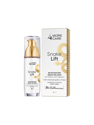 Pleťové sérum Snake Lift vyhladzuje pokožku, zabraňuje jej ochabovaniu a tvorbe nových mimických vrások. Aktivuje regeneračné a opravné mechanizmy, čo vedie k zvýšenej elasticite a hydratácii pokožky. Pokročilé zloženie poskytuje okamžitý efekt vyhladenia vrások už po prvom použití.