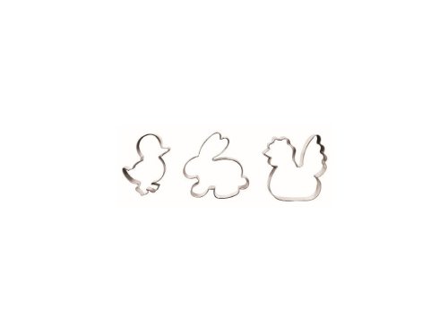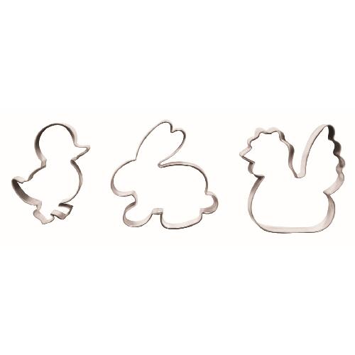 Súprava 3 ks veľkonočných vykrajovačiek. Obsahuje kačičku, zajačika, sliepočku. Materiál pocínovaný zdravotne nezávadný plech. Rozmery 59 až 70 mm, výška pásky 16 mm. Český výrobca. EAN 8594021417364