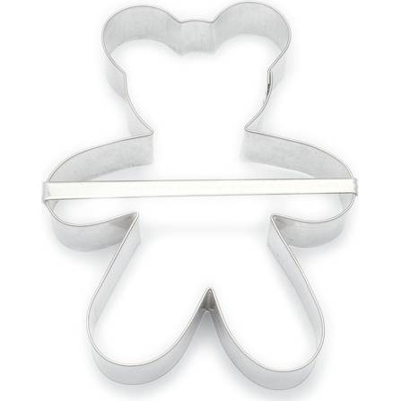 Vykrajovač z pocínovaného plechu v tvare medvedíka s rozmermi 10 x 13,8 cm.