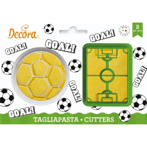 Súprava dvoch plastových vykrajovačov v podobe lopty a futbalového ihriska.