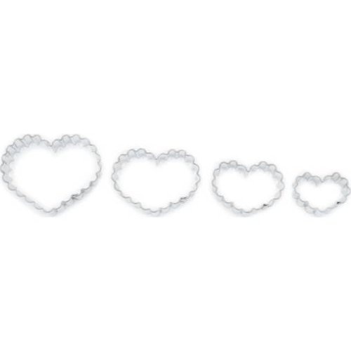 Vykrajovače cukroviniek v tvare srdca s vrúbkovaným okrajom – sada 4 kusov rôznej veľkosti.