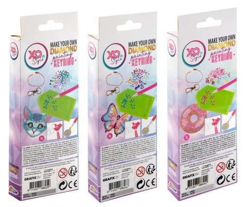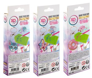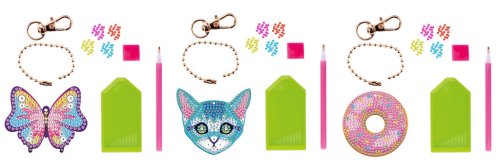 Výroba klíčenek „Dimond“ – tři druhy kočička, donut a motýlek. Pomocí aplikátoru nalep kamínky na předem připravený tvar klíčenky. Součástí balení je aplikátor, kamínky, řetízek a karabinka.