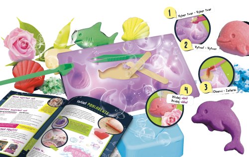 Kreatívna sada na výrobu mydiel. Sada obsahuje: formičky na mydlo, farebnú esenciu, vôňu, glycerínové vločky, drevenú špachtľu a odmerku.