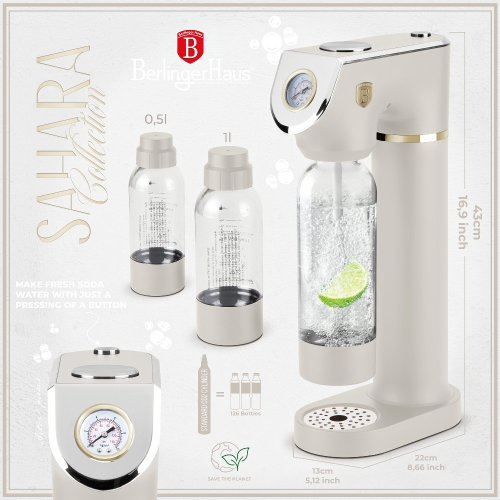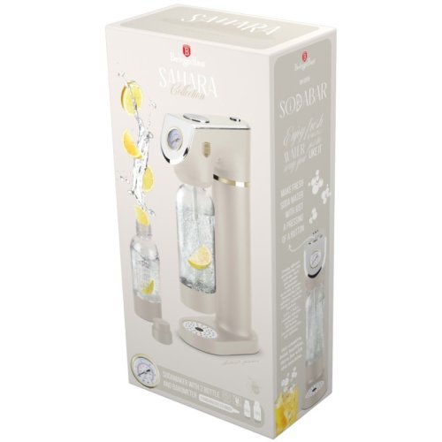Objavte domáci výrobník sódy Berlingerhaus Sodabar Sahara Collection , ktorý v sebe spája praktické vybavenie domácnosti a moderný dizajn. Štýlová kombinácia matnej krémovej a zlatej farby skvele doplní každú kuchyňu. 2 fľaše v balení vám umožnia mať čerstvú sódu vždy po ruke.