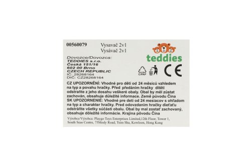 Deti sa môžu hrať na vysávanie izbičky, ako keby to bol skutočný vysávač. Vysávač vydáva zvukové a svetelné efekty, v priehľadnom valci sa počas vysávania víria farebné papieriky. Rozmer krabice 24 x 54 x 13 cm Vhodné od 24 mesiacov