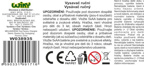 Vysávač ručný. Veľkosť 36cm. 5xAA batérie nie sú súčasťou. Svetelné a zvukové efekty. Náhradný nadstavec na vysávanie.