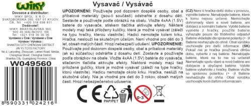 Vysávač s efektmi. Veľkosť 24 cm. 4xAA batérie nie sú súčasťou. Funkcia vysávania. Obsahuje vysávač a guličky na vysávanie. Vysávač sa dá otvoriť a vysatý obsah vysypať.