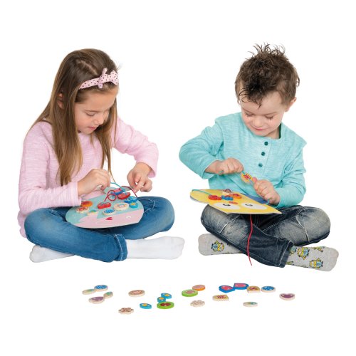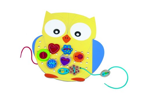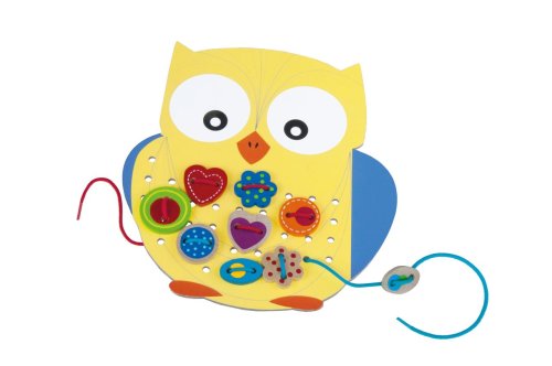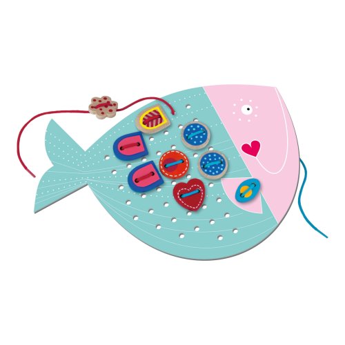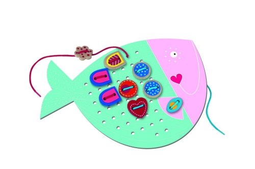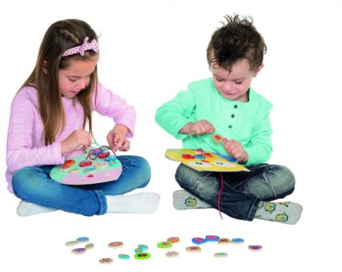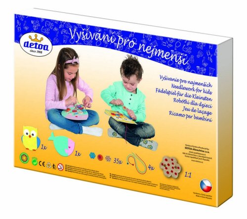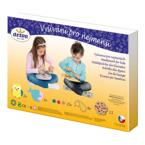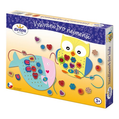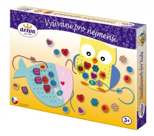 Balenie obsahuje dve krásne kartónové predlohy (veľmi pevný materiál) sovu a rybičku, na ktorú deti pomocou šnúrok prišívajú drevené komponenty. Rozmer krabice: 33 x 23 x 3,5 cm Vhodné od 3 rokov