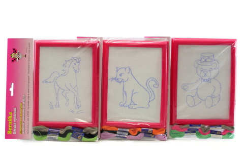 Kreatívny set na vyšívanie pre všetky šikovné dievčatká a malé krajčírky. Sada obsahuje plastový rámček s napnutým plátienkom s predtlačeným obrázkom. Súprava v niekoľkých farebných kombináciách bavlniek a rámu, av niekoľkých motívoch obrázku.