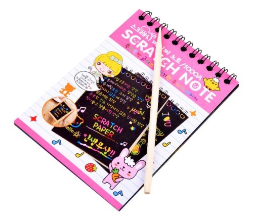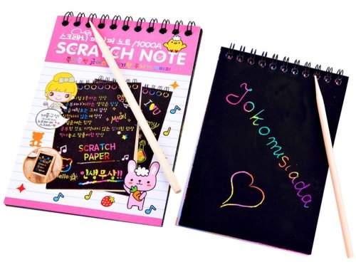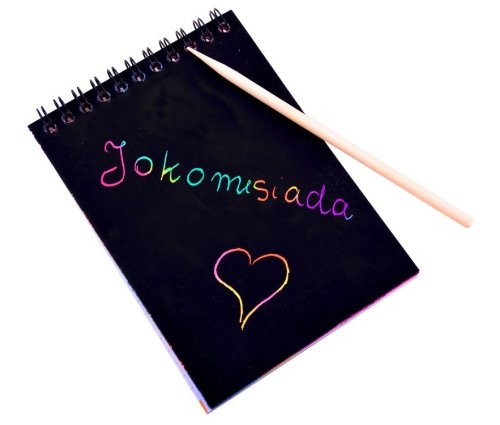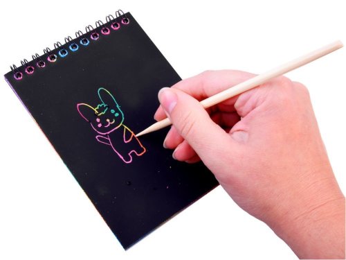 Zápisník s čiernymi stránkami skrýva kúzelne dúhové pozadie. Na vytvorenie obrázku, nápisu, odkazu, blahoželania, vzoru alebo milostného listu postačí priložené vyškrabávacie pero. Postup: Z obrázku odstráňte ochrannú prednú fóliu. Priloženým škrabacím perom vytvorte vlastné pestrofarebné diela. Balenie obsahuje:
