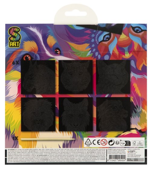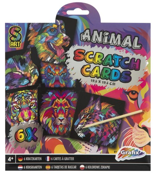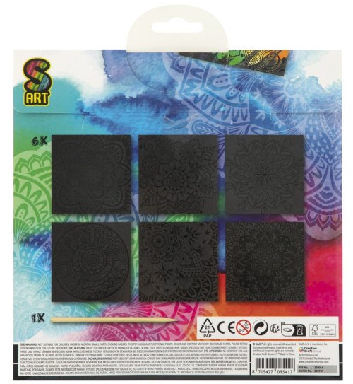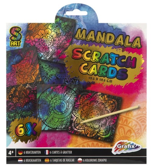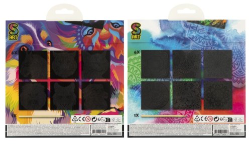 Vyšrabávacie obrázky 6 ks v bablení. Veľkosť obrázku 19,5×19,5 cm, balenie obsahuje aj škrabátko. Dva rôzne druhy obrázkov - zvieratká a mandala.