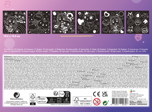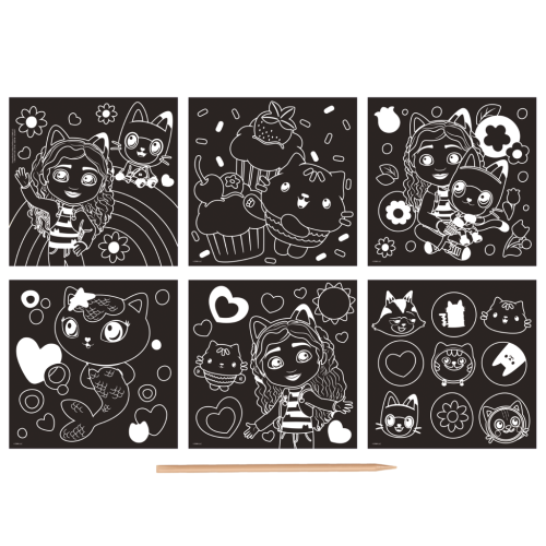 Vyškrabávacie obrázky s motívom postavičiek z rozprávky Gábinin kúzelný domček. V balení 6 obrázkov s rozmermi 19,5x19,5 cm a drevené vyškrabávacie pero. Vek 3+