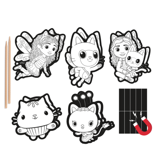 Vyškrabávacie obrázky s motívom postavičiek z rozprávky Gábinin kúzelný domček. V balení 10 obrázkov, 2 drevené perá a hárok s magnetmi. Rozmery balenia 15x25 cm. Vek 3+