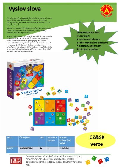 "Vyslov slová" je logopedická hra, ktorá má za cieľ rozvoj reči u detí v predškolskom veku a na prvom stupni základnej školy. Pomáha s vyslovovaním písmen "S", "C" "Z", "Š", "Č", "Ž". Počas hry sa deti učia zábavným spôsobom vyslovovať slová s problematickými hláskami, cvičia postreh, vnímanie, myslenie a pozornosť . má dve varianty pre mladšie a staršie deti, alebo podľa schopností detí a počtu hráčov.V oboch variantoch je veľmi dôležitá rola rodiča (pedagóga), má za úlohu pomôcť hráčom k správnej výslovnosti a kontrolu nad vyslovovanými hláskami.Obe varianty je možné prispôsobiť si znalostiam dieťaťa, tak aby pre neho hra bola nielen náučná, ale aj zábavná.Víťazom hry sa vždy stáva ten, kto nazbiera najviac obrázkov.Balenie obsahuje: 96 obrázkov obsahujúcich v názve "s", "c", "z" a "š" , "č", "ž" farebnú herný kockuprehľad používaných slovhrací doskučeský a slovenský návod k hre Hlavné vlastnosti: logopedická hra, ktorá má za cieľ rozvoj rečiprecvičuje postreh, vnímanie, myslenie a pozornosť zábavná a zároveň náučná Dokumentácia: návod k hre CZ,SK