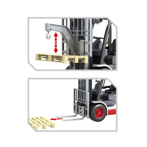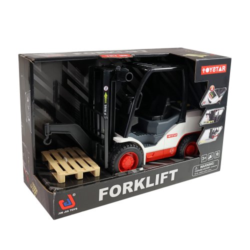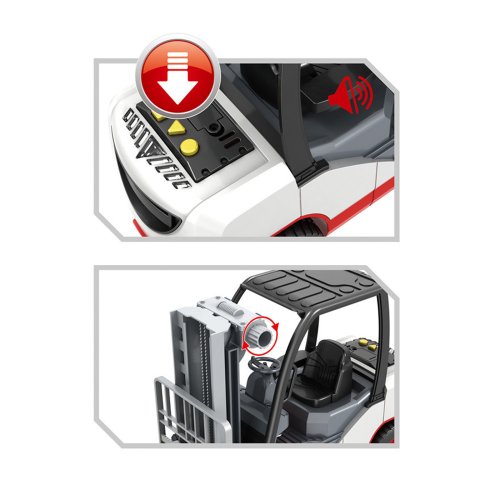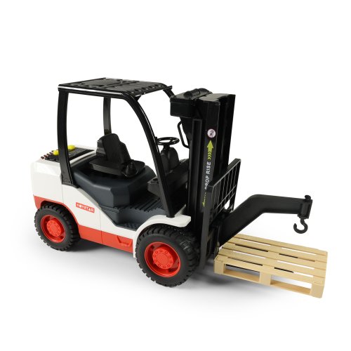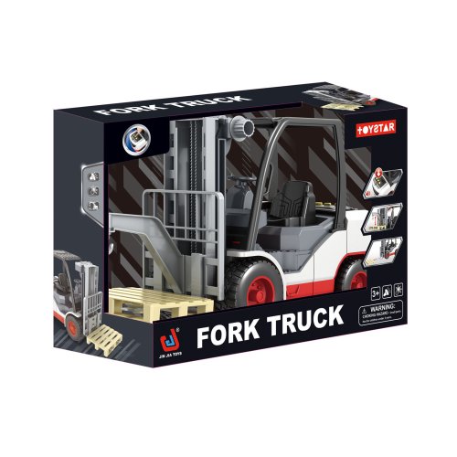 Vysokozdvižný vozík s manuálne pohyblivými časťami. Vozidlo má pogumované kolesá, ktoré zlepšujú jeho jazdné vlastnosti. Je vyrobené z kvalitných plastov, jazdí na zotrvačník a jeho dĺžka je 30 cm. Pomocou tlačidiel aktivujeme svetelný a zvukový efekt, je nutné použitie 3 ks batérií typu AG13, ktoré sú súčasťou balenia.