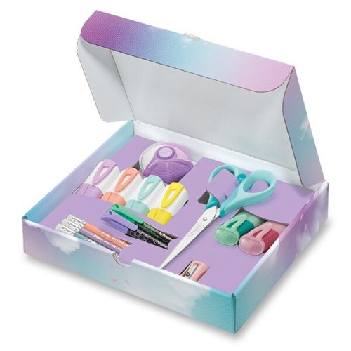 SADA OBSAHUJE:, * 6 ks zvýrazňovačov Fluo'Peps Pastel a Glitter, * 2 ks písacích pier Graph'Peps, * 3 ks grafitových ceruziek HB Black'Peps, * nožnice Sensoft 16 cm, * guma Zenoa Plus, * Orevátka