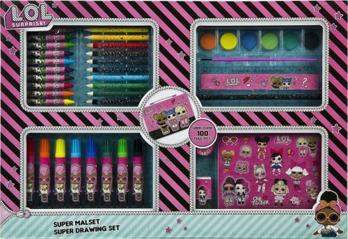 Kresliarska súprava pre deti v plastovom kufríku s motívom LOL . Surprise. Sada obsahuje: 10 voskoviek, 10 pasteliek, 8 fixiek, 6 vodových farieb so štetčekom, pravítko, gumu, strúhadlo, 20 šablón na vyfarbenie, 4 listy samolepiek. Vhodné pre deti od 3 rokov.
