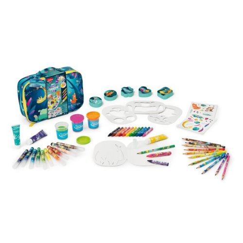 Kufrík obsahuje:, * 12 pasteliek Jumbo Jungle Fever, * 12 fixiek Jumbo Jungle Fever, * 12 voskoviek Jumbo Jungle Fever, * 3 tuby s prstovými farbami (30 ml), * 3 tégliky s modelovacou hmotou (84 g), * 5 pečiatok s 2 motívmi s rôznymi motívmi, * papierový obrus pre čistú tvorbu