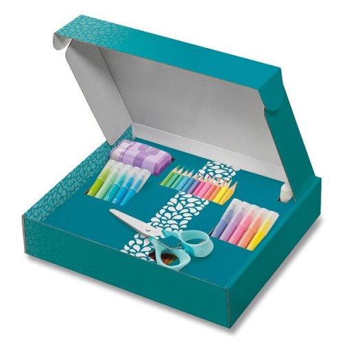 Sada obsahuje:, * 10 fixiek Color'Peps, * 12 pasteliek Color'Peps, * 1 pár nožníc 13 cm, * 1 ks strúhadla, * 1 ks gumy, * 1 ks téglik na ceruzky, Rozmery boxu: 27 x 21 x 5 cm