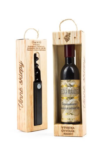 Vývrtka v tvare vínnej fľaše s originálnou potlačou vinety je vhodným darčekom pre všetkých milovníkov vína. Užite si svoju chvíľku v dobrej spoločnosti! Vývrtka s magnetom na uchytenie na chladničku je balená v darčekovej krabičke. Rozmer 12,5 x 3,5 x 2,5 cm.