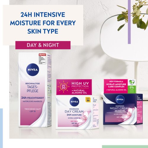 Suchá a citlivá pleť potrebuje špeciálnu starostlivosť, ktorá jej dodá nielen potrebnú hydratáciu, ale aj výživu a ochranu. Tento hĺbkovo vyživujúci denný krém s prírodným mandľovým olejom a Moisture Care komplexom poskytuje okamžitú úľavu od pocitu napätia a zaisťuje hydratáciu až na 24 hodín. Chráni pred stratou vlhkosti, tvorbou šupiniek aj predčasným starnutím vďaka ochrane SPF 30.