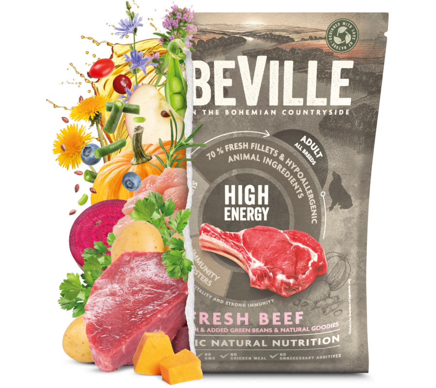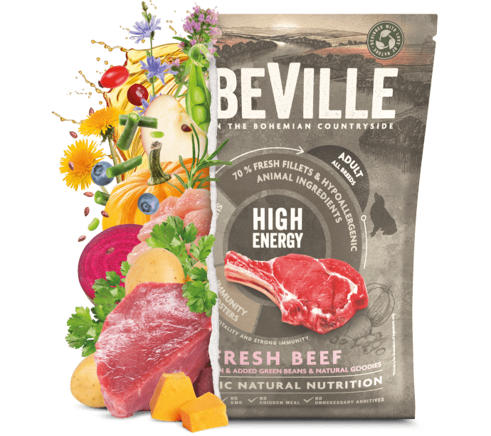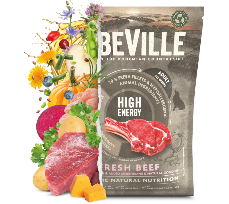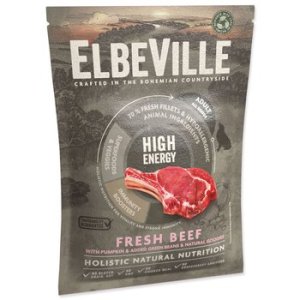ELBEVILLE je prirodzená strava pre celkové zdravie Vášho psa . Je vyrobená z najlepších prírodných, lokálnych surovín vrátane tzv. superpotravín as vysokým obsahom kvalitného čerstvého mäsa. Táto receptúra obsahuje 35% čerstvých vykostených filétov z hovädzieho a ďalej 26%